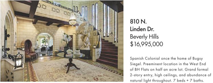 810 N. Linden Dr. Beverly Hills $16,995,000 Spanish Colonial once the home of Bugsy Siegel. Preeminent location in the West End of BH Flats on half an acre lot. Grand formal 2-story entry, high ceilings, and abundance of natural light throughout. 7 beds + 7 baths.