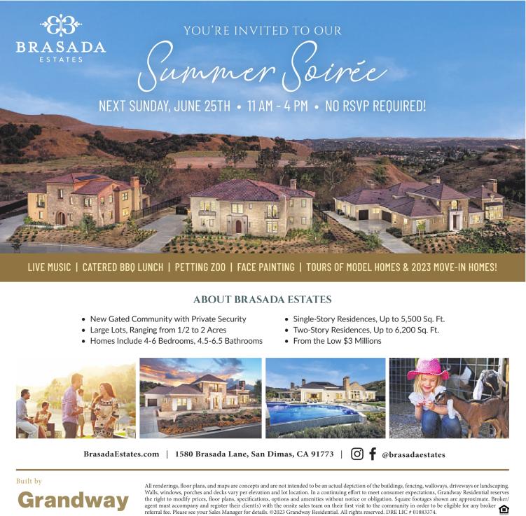 YOU’RE INVITED TO OUR NEXT SUNDAY, JUNE 25TH • 11 AM - 4 PM • NO RSVP REQUIRED! LIVE MUSIC | CATERED BBQ LUNCH | PETTING ZOO | FACE PAINTING | TOURS OF MODEL HOMES & 2023 MOVE-IN HOMES! ABOUT BRASADA ESTATES • New Gated Community with Private Security • Large Lots, Ranging from 1/2 to 2 Acres • Homes Include 4-6 Bedrooms, 4.5-6.5 Bathrooms • Single-Story Residences, Up to 5,500 Sq. Ft. • Two-Story Residences, Up to 6,200 Sq. Ft. • From the Low $3 Millions BrasadaEstates.com | 1580 Brasada Lane, San Dimas, CA 91773 | @brasadaestates Built by All renderings, floor plans, and maps are concepts and are not intended to be an actual depiction of the buildings, fencing, walkways, driveways or landscaping. Walls, windows, porches and decks vary per elevation and lot location. In a continuing effort to meet consumer expectations, Grandway Residential reserves the right to modify prices, floor plans, specifications, options and amenities without notice or obligation. Square footages shown are approximate. Broker/ agent must accompany and register their client(s) with the onsite sales team on their first visit to the community in order to be eligible for any broker referral fee. Please see your Sales Manager for details. ©2023 Grandway Residential. All rights reserved. DRE LIC # 01883374.