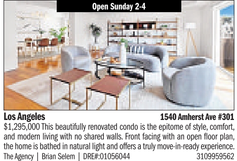 Los Angeles 1540AmherstAve #301 $1,295,000 This beautifully renovated condo is the epitome of style, comfort, and modern living with no shared walls. Front facing with an open floor plan, the home is bathed in natural light and offers a truly move-in-ready experience.