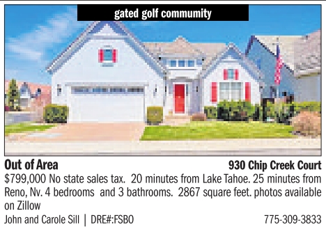gated golf commumity Out of Area 930 Chip Creek Court $799,000 No state sales tax. 20 minutes from Lake Tahoe. 25 minutes from Reno, Nv. 4 bedrooms and 3 bathrooms. 2867 square feet. photos available on Zillow John and Carole Sill | DRE#:FSBO 775-309-3833