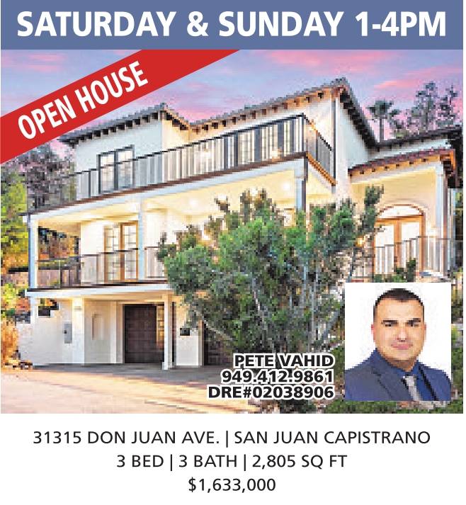 SATURDAY & SUNDAY 1-4PM PETE VAHID 949.412.9861 DRE#02038906 31315 DON JUAN AVE. | SAN JUAN CAPISTRANO 3 BED | 3 BATH | 2,805 SQ FT $1,633,000 See also