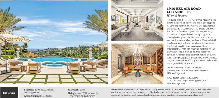 The Details Location: 1940 Bel Air Road, Los Angeles 90077 Asking price: $29,950,000 Year built: 2013 Living area: 17,013 square feet, 8 bedrooms, 15 bathrooms 1940 BEL AIR ROAD LOS ANGELES Hilton & Hyland Introducing 1940 Bel Air Road, an exquisite estate nestled in one of the most prestigious neighborhoods in the world. Set against the picturesque backdrop of the Stone Canyon Reservoir, this home presents captivating views and unparalleled tranquility. Step through the grand entrance and immerse yourself in a world of opulence. Every detail has been meticulously crafted, showcasing the finest quality and craftsmanship throughout. From the soaring ceilings to the carefully curated finishes, this residence exudes elegance and sophistication at every turn. This prestigious Bel Air estate offers not only an exceptional living experience but also an unparalleled location. David Kramer, DRE#: 00996960 310.691.2400 / info@davidkramer.com Hilton & Hyland Roya Sklar, DRE#: 02021699 213.713.4456 / royasklar@gmail.com Hilton & Hyland Features: Expansive floor plan; formal living room; family room; study; gourmet kitchen; custom cabinetry; private primary suite, spa-like bathroom, walk-in closet; elevator; home theatre; wine cellar; gym; indoor pool; sauna; landscaped grounds; manicured gardens; sparkling pool See also
