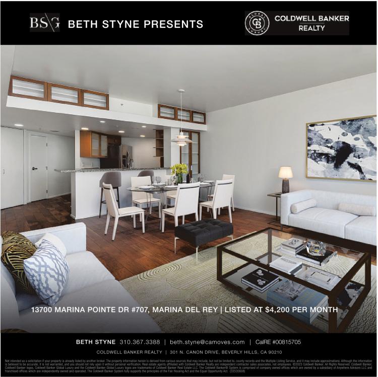 BETH ST YNE PRESENTS 13700 MARINA POINTE DR #707, MARINA DEL REY | LISTED AT $4,200 PER MONTH BETH STYNE 310.367.3388 | beth.styne@camoves.com | CalRE #00815705 COLDWELL BANKER RE ALT Y | 301 N. CANON DRIVE, BE VERLY HILLS, CA 9 0210 Not intended as a solicitation if your property is already listed by another broker. The property information herein is derived from various sources that may include, but not be limited to, county records and the Multiple Listing Service, and it may include approximations. Although the information is believed to be accurate, it is not warranted, and you should not rely upon it without personal verification. Real estate agents affiliated with Coldwell Banker Realty are independent contractor sales associates, not employees. ©2023 Coldwell Banker. All Rights Reserved. Coldwell Banker, Coldwell Banker logos, Coldwell Banker Global Luxury and the Coldwell Banker Global Luxury logos are trademarks of Coldwell Banker Real Estate LLC. The Coldwell Banker® System is comprised of company owned offices which are owned by a subsidiary of Anywhere Advisors LLC and franchised offices which are independently owned and operated. The Coldwell Banker System fully supports the principles of the Fair Housing Act and the Equal Opportunity Act. (33535608)