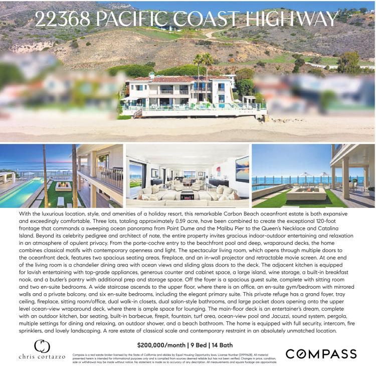 With the luxurious location, style, and amenities of a holiday resort, this remarkable Carbon Beach oceanfront estate is both expansive and exceedingly comfortable. Three lots, totaling approximately 0.59 acre, have been combined to create the exceptional 120-foot frontage that commands a sweeping ocean panorama from Point Dume and the Malibu Pier to the Queen’s Necklace and Catalina Island. Beyond its celebrity pedigree and architect of note, the entire property invites gracious indoor-outdoor entertaining and relaxation in an atmosphere of opulent privacy. From the porte-cochre entry to the beachfront pool and deep, wraparound decks, the home combines classical motifs with contemporary openness and light. The spectacular living room, which opens through multiple doors to the oceanfront deck, features two spacious seating areas, fireplace, and an in-wall projector and retractable movie screen. At one end of the living room is a chandelier dining area with ocean views and sliding glass doors to the deck. The adjacent kitchen is equipped for lavish entertaining with top-grade appliances, generous counter and cabinet space, a large island, wine storage, a built-in breakfast nook, and a butler’s pantry with additional prep and storage space. Off the foyer is a spacious guest suite, complete with sitting room and two en-suite bedrooms. A wide staircase ascends to the upper floor, where there is an office, an en-suite gym/bedroom with mirrored walls and a private balcony, and six en-suite bedrooms, including the elegant primary suite. This private refuge has a grand foyer, tray ceiling, fireplace, sitting room/office, dual walk-in closets, dual salon-style bathrooms, and large pocket doors opening onto the upper level ocean-view wraparound deck, where there is ample space for lounging. The main-floor deck is an entertainer’s dream, complete with an outdoor kitchen, bar seating, built-in barbecue, firepit, fountain, turf area, ocean-view pool and Jacuzzi, sound system, pergola, multiple settings for dining and relaxing, an outdoor shower, and a beach bathroom. The home is equipped with full security, intercom, fire sprinklers, and lovely landscaping. A rare estate of classical scale and contemporary restraint in an absolutely unmatched location.