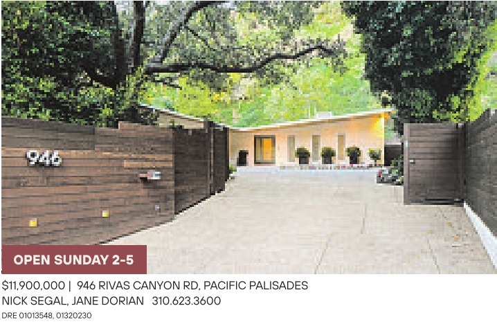 OPEN SUNDAY 2-5 $11,900,000 | 946 RIVAS CANYON RD, PACIFIC PALISADES NICK SEGAL, JANE DORIAN 310.623.3600 DRE 01013548, 01320230 RENDERING See also