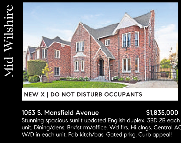 NEW X | DO NOT DISTURB OCCUPANTS 1053 S. Mansfield Avenue $1,835,000 Stunning spacious sunlit updated English duplex. 3BD 2B each unit. Dining/dens. Brkfst rm/office. Wd flrs. Hi clngs. Central AC. W/D in each unit. Fab kitch/bas. Gated prkg. Curb appeal!