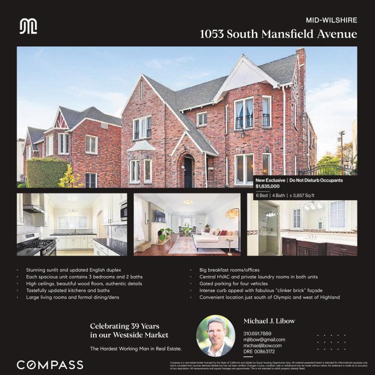 MID-WILSHIRE 1053 South Mansfield Avenue New Exclusive | Do Not Disturb Occupants $1,835,000 6 Bed | 4 Bath | ± 3,857 Sq ft • Stunning sunlit and updated English duplex • Each spacious unit contains 3 bedrooms and 2 baths • High ceilings, beautiful wood floors, authentic details • Tastefully updated kitchens and baths • Large living rooms and formal dining/dens • Big breakfast rooms/offices • Central HVAC and private laundry rooms in both units • Gated parking for four vehicles • Intense curb appeal with fabulous “clinker brick” façade • Convenient location just south of Olympic and west of Highland Celebrating 39 Years in our Westside Market The Hardest Working Man in Real Estate. Michael J. Libow 310.691.7889 mjlibow@gmail.com michaeljlibow.com DRE 00863172 Compass is a real estate broker licensed by the State of California and abides by Equal Housing Opportunity laws. All material presented herein is intended for informational purposes only and is compiled from sources deemed reliable but has not been verified. Changes in price, condition, sale or withdrawal may be made without notice. No statement is made as to accuracy of any description. All measurements and square footages are approximate. This is not intended to solicit property already listed.
