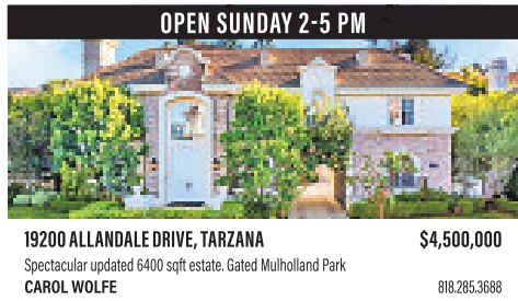 yes OPEN SUNDAY 2-5 PM 19200 ALLANDALE DRIVE, TARZANA $4,500,000 Spectacular updated 6400 sqft estate. Gated Mulholland Park CAROL WOLFE 818.285.3688 See also