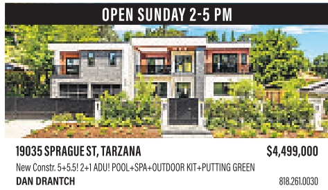 yes OPEN SUNDAY 2-5 PM 19035 SPRAGUE ST, TARZANA $4,499,000 New Constr. 5+5.5! 2+1 ADU! POOL+SPA+OUTDOOR KIT+PUTTING GREEN DAN DRANTCH 818.261.0030 See also