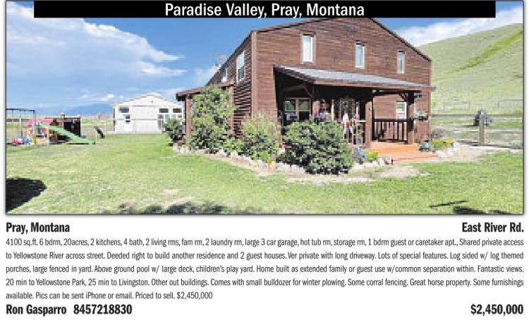 Paradise Valley, Pray, Montana Pray, Montana East River Rd. 4100 sq.ft.6 bdrm,20acres,2 kitchens,4 bath,2 living rms,fam rm,2 laundry rm,large 3 car garage,hot tub rm,storage rm,1 bdrm guest or caretaker apt.,Shared private access toYellowstone River across street. Deeded right to build another residence and 2 guest houses.Ver private with long driveway. Lots of special features. Log sided w/ log themed porches, large fenced in yard.Above ground pool w/ large deck, children’s play yard. Home built as extended family or guest use w/common separation within. Fantastic views. 20 min toYellowstone Park, 25 min to Livingston. Other out buildings. Comes with small bulldozer for winter plowing. Some corral fencing. Great horse property. Some furnishings available. Pics can be sent iPhone or email. Priced to sell. $2,450,000 Ron Gasparro 8457218830 $2,450,000