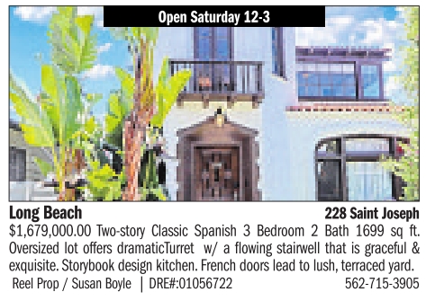 Open Saturday 12-3 Long Beach 228 Saint Joseph $1,679,000.00 Two-story Classic Spanish 3 Bedroom 2 Bath 1699 sq ft. Oversized lot offers dramaticTurret w/ a flowing stairwell that is graceful & exquisite. Storybook design kitchen. French doors lead to lush, terraced yard. Reel Prop / Susan Boyle | DRE#:01056722 562-715-3905