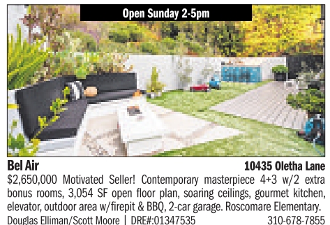 Open Sunday 2-5pm Bel Air 10435 Oletha Lane $2,650,000 Motivated Seller! Contemporary masterpiece 4+3 w/2 extra bonus rooms, 3,054 SF open floor plan, soaring ceilings, gourmet kitchen, elevator, outdoor area w/firepit & BBQ, 2-car garage. Roscomare Elementary. Douglas Elliman/Scott Moore | DRE#:01347535 310-678-7855 See also