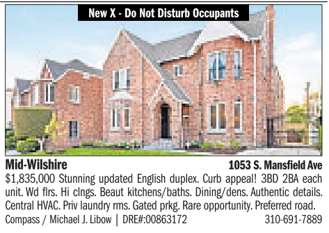 New X - Do Not Disturb Occupants Mid-Wilshire 1053 S. MansfieldAve $1,835,000 Stunning updated English duplex. Curb appeal! 3BD 2BA each unit. Wd flrs. Hi clngs. Beaut kitchens/baths. Dining/dens. Authentic details. Central HVAC. Priv laundry rms. Gated prkg. Rare opportunity. Preferred road. Compass / Michael J. Libow | DRE#:00863172 310-691-7889