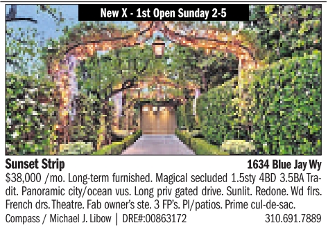 New X - 1st Open Sunday 2-5 Sunset Strip 1634 Blue JayWy $38,000 /mo. Long-term furnished. Magical secluded 1.5sty 4BD 3.5BA Tradit. Panoramic city/ocean vus. Long priv gated drive. Sunlit. Redone. Wd flrs. French drs.Theatre. Fab owner’s ste. 3 FP’s. Pl/patios. Prime cul-de-sac. Compass / Michael J. Libow | DRE#:00863172 310.691.7889