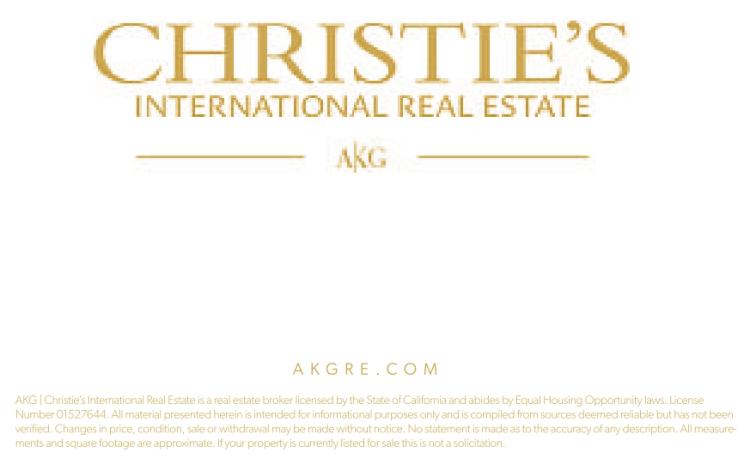 A K G R E . C O M AKG | Christie’s International Real Estate is a real estate broker licensed by the State of California and abides by Equal Housing Opportunity laws. License Number 01527644. All material presented herein is intended for informational purposes only and is compiled from sources deemed reliable but has not been verified. Changes in price, condition, sale or withdrawal may be made without notice. No statement is made as to the accuracy of any description. All measurements and square footage are approximate. If your property is currently listed for sale this is not a solicitation.