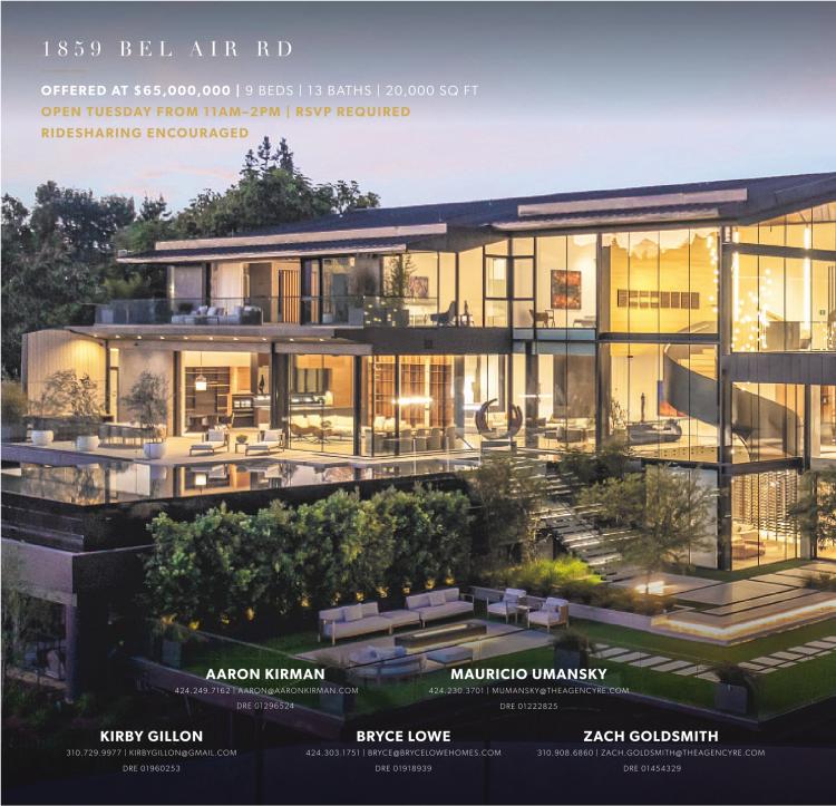 1 8 5 9 B E L A I R R D OFFERED AT $65,000,000 | 9 BEDS | 13 BATHS | 20,000 SQ FT OPEN TUESDAY FROM 11AM–2PM | RSVP REQUIRED RIDESHARING ENCOURAGED AARON KIRMAN 424.249.7162 | AARON@AARONKIRMAN.COM DRE 01296524 MAURICIO UMANSKY 424.230.3701 | MUMANSKY@THEAGENCYRE.COM DRE 01222825 KIRBY GILLON 310.729.9977 | KIRBYGILLON@GMAIL.COM DRE 01960253 BRYCE LOWE 424.303.1751 | BRYCE@BRYCELOWEHOMES.COM DRE 01918939 ZACH GOLDSMITH 310.908.6860 | ZACH.GOLDSMITH@THEAGENCYRE.COM DRE 01454329