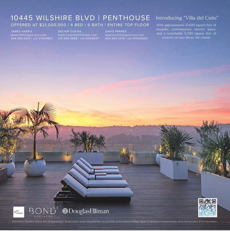 1 0 4 4 5 W I L S H I R E B LV D | P E N T H O U S E Introducing “Villa del Cielo” OFFERED AT $21,000,000 | 4 BED | 6 BATH | ENTIRE TOP FLOOR JAMES HARRIS BACHIR OUEIDA DAVID PARNES james@ theagencyre.com bachir.oueida@ elliman.com dparnes@ theagencyre.com 424.400.5915 | LIC:01909801 310.595.3888 | LIC:00936311 424.400.5916 | LIC:01905862 With approximately 6,600 square feet of bespoke, contemporary interior space, and a remarkable 5,540 square feet of exterior terrace above the clouds. Information deemed reliable but not guaranteed. Broker/Agent does not guarantee the accuracy of the square footage. Buyer is advised to independently verify the accuracy of all information.