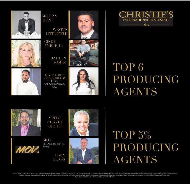 MORGAN TRENT WESTON LITTLEFIELD CINDY AMBUEHL DALTON GOMEZ TOP 6 BRYCE LOWE + KIRBY GILLON TEAM TOP SALES VOLUME - TEAM PRODUCING AGENTS SPITZ CHAVEZ GROUP MOV TOP PRODUCTION IN UNITS TOP 5% PRODUCING GARY GLASS AGENTS AKG | Christie’s International Real Estate is a real estate broker licensed by the State of California and abides by Equal Housing Opportunity laws. License Number 01527644. All material presented herein is intended for informational purposes only and is compiled from sources deemed reliable but has not been verified. Changes in price, condition, sale or withdrawal may be made without notice. No statement is made as to the accuracy of any description. All measurements and square footage are approximate. If your property is currently listed for sale this is not a solicitation.