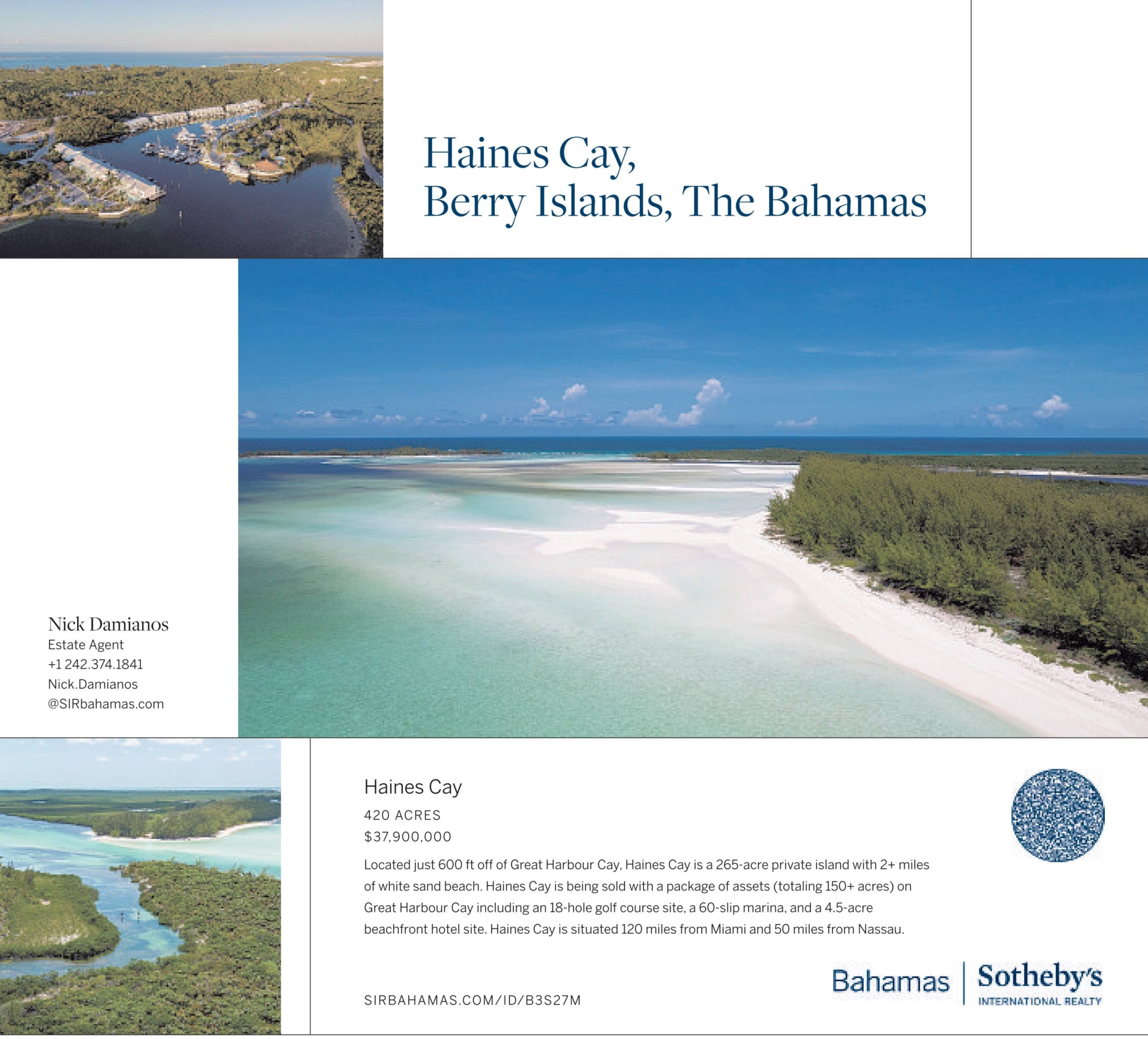 Located just 600 ft off of Great Harbour Cay, Haines Cay is a 265-acre private island with 2+ miles of white sand beach. Haines Cay is being sold with a package of assets (totaling 150+ acres) on Great Harbour Cay including an 18-hole golf course site, a 60-slip marina, and a 4.5-acre beachfront hotel site. Haines Cay is situated 120 miles from Miami and 50 miles from Nassau.