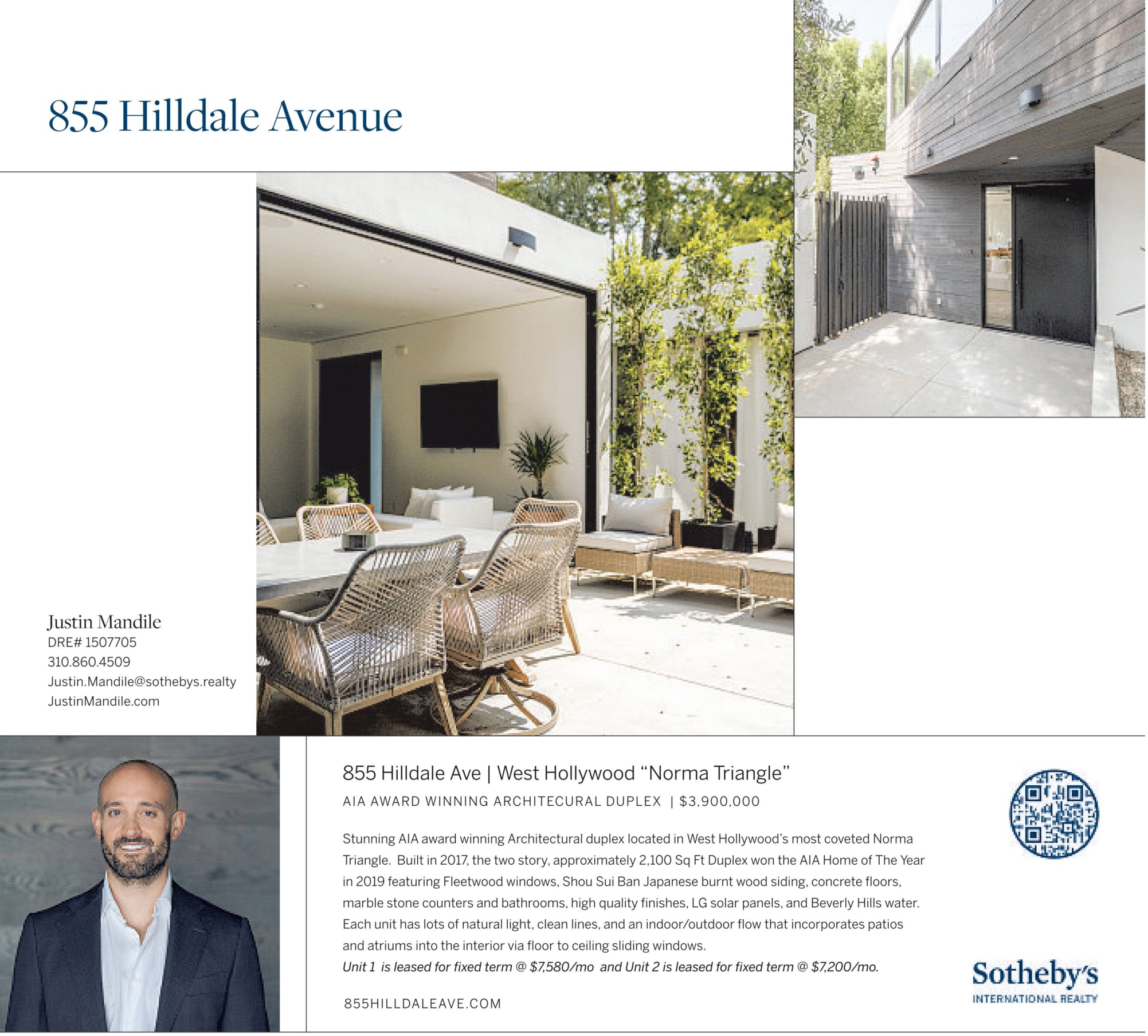 Stunning AIA award winning Architectural duplex located in West Hollywood’s most coveted Norma Triangle. Built in 2017, the two story, approximately 2,100 Sq Ft Duplex won the AIA Home of The Year in 2019 featuring Fleetwood windows, Shou Sui Ban Japanese burnt wood siding, concrete floors, marble stone counters and bathrooms, high quality finishes, LG solar panels, and Beverly Hills water. Each unit has lots of natural light, clean lines, and an indoor/outdoor flow that incorporates patios and atriums into the interior via floor to ceiling sliding windows.