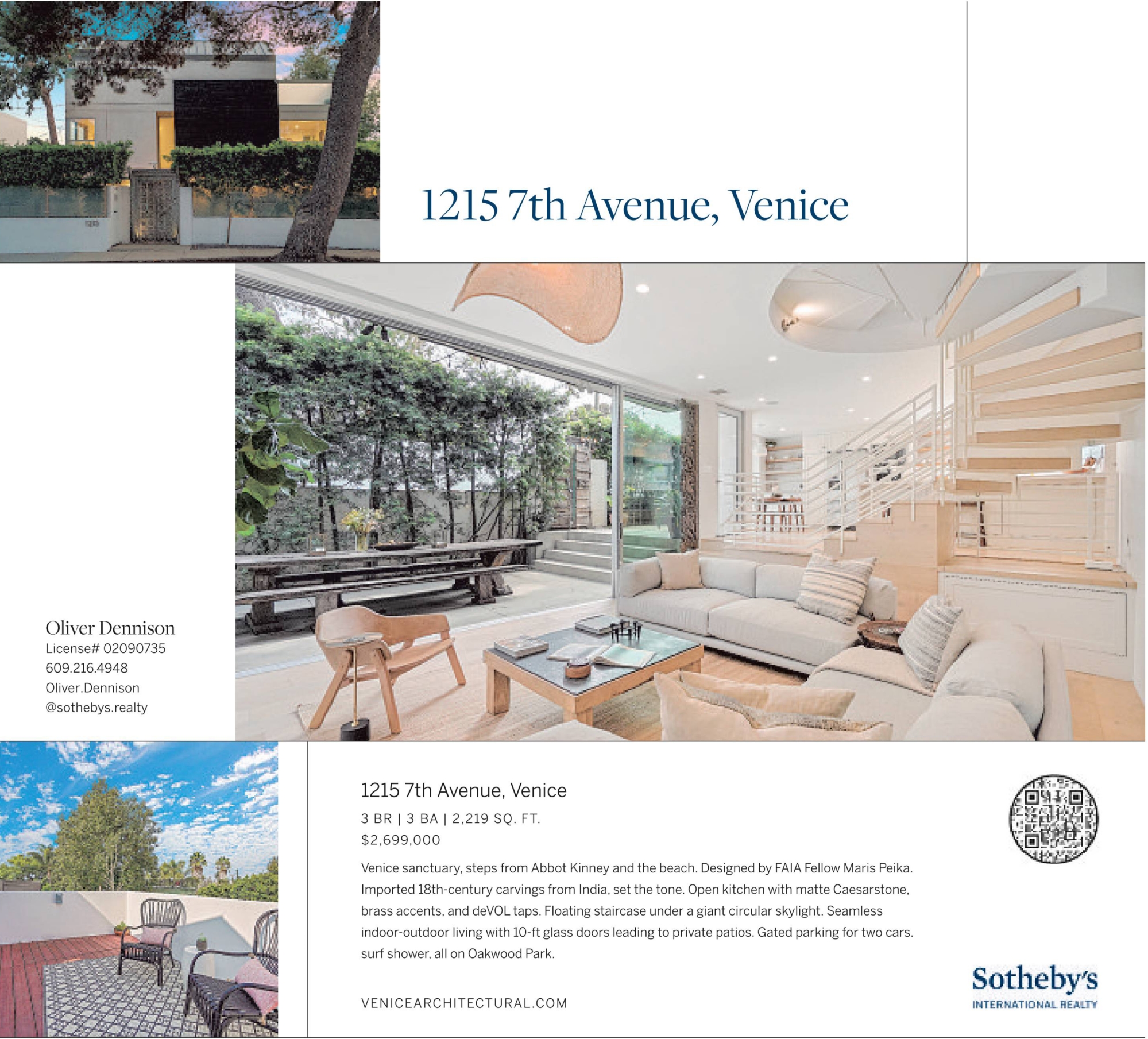 Venice sanctuary, steps from Abbot Kinney and the beach. Designed by FAIA Fellow Maris Peika. Imported 18th-century carvings from India, set the tone. Open kitchen with matte Caesarstone, brass accents, and deVOL taps. Floating staircase under a giant circular skylight. Seamless indoor-outdoor living with 10-ft glass doors leading to private patios. Gated parking for two cars, surf shower, all on Oakwood Park.