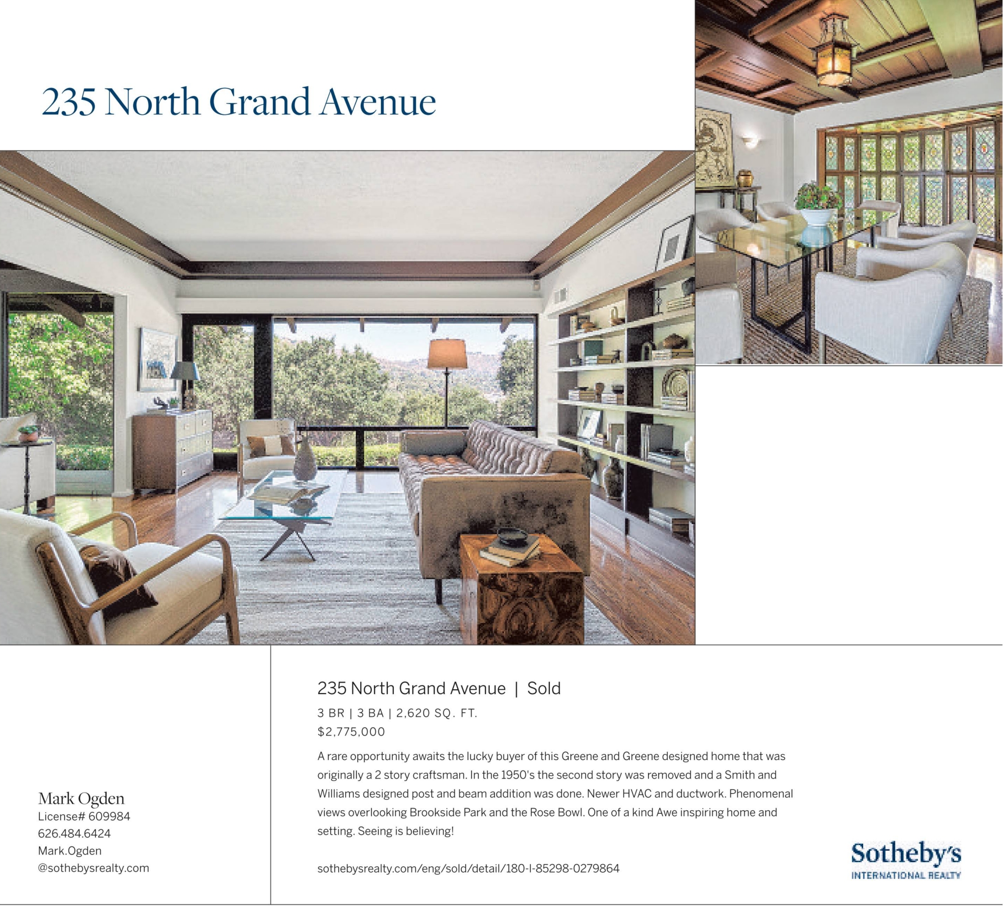 A rare opportunity awaits the lucky buyer of this Greene and Greene designed home that was originally a 2 story craftsman. In the 1950's the second story was removed and a Smith and Williams designed post and beam addition was done. Newer HVAC and ductwork. Phenomenal views overlooking Brookside Park and the Rose Bowl. One of a kind Awe inspiring home and setting. Seeing is believing!