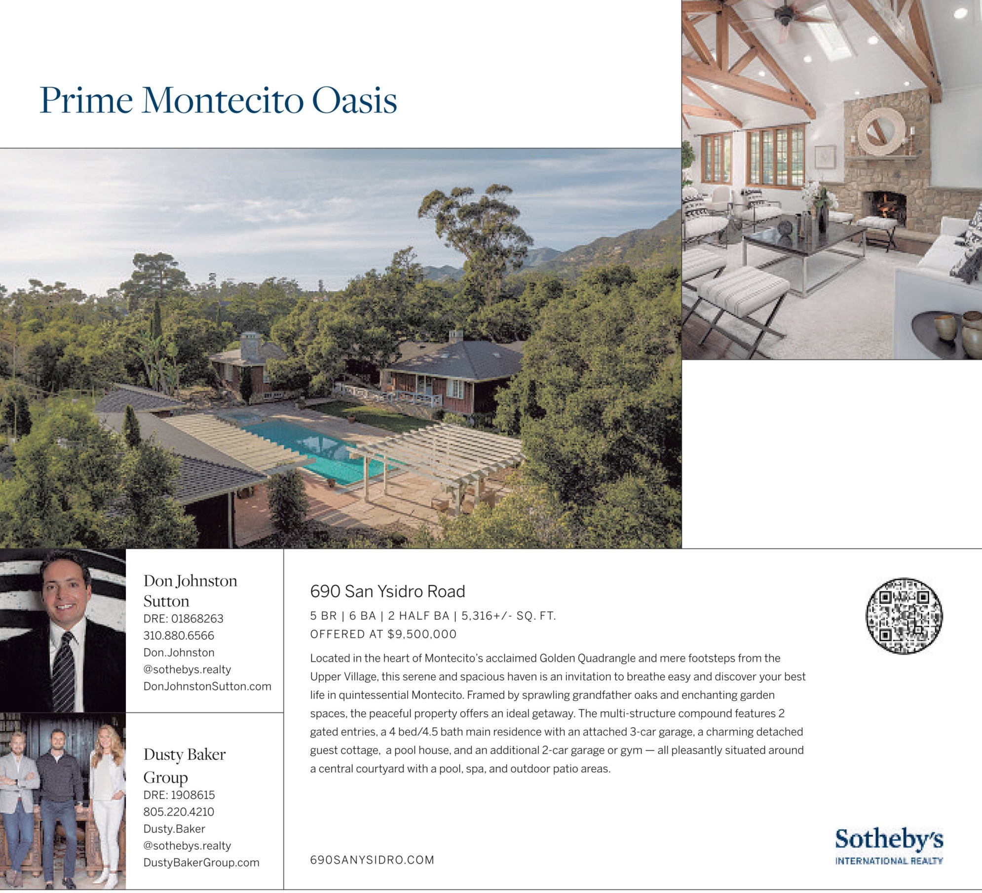 Located in the heart of Montecito’s acclaimed Golden Quadrangle and mere footsteps from the Upper Village, this serene and spacious haven is an invitation to breathe easy and discover your best life in quintessential Montecito. Framed by sprawling grandfather oaks and enchanting garden spaces, the peaceful property offers an ideal getaway. The multi-structure compound features 2 gated entries, a 4 bed/4.5 bath main residence with an attached 3-car garage, a charming detached guest cottage, a pool house, and an additional 2-car garage or gym — all pleasantly situated around a central courtyard with a pool, spa, and outdoor patio areas.