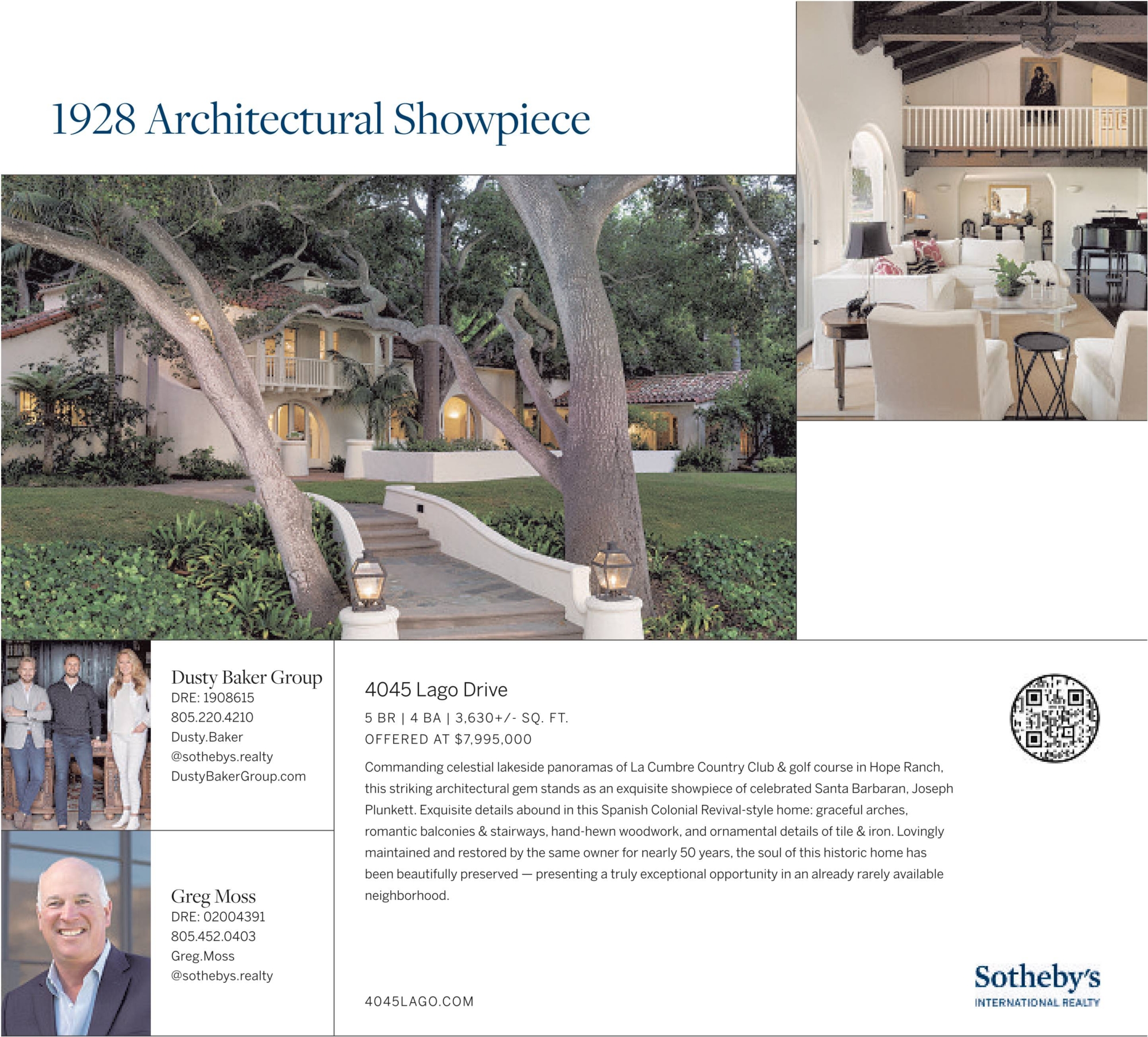 1928 Architectural Showpiece Dusty Baker Group DRE: 1908615 805.220.4210 Dusty.Baker@sothebys.realty DustyBakerGroup.com Greg Moss DRE: 02004391 805.452.0403 Greg.Moss@sothebys.realty 4045 Lago Drive 5 BR | 4 BA | 3,630+/- SQ. FT. OFFERED AT $7,995,000