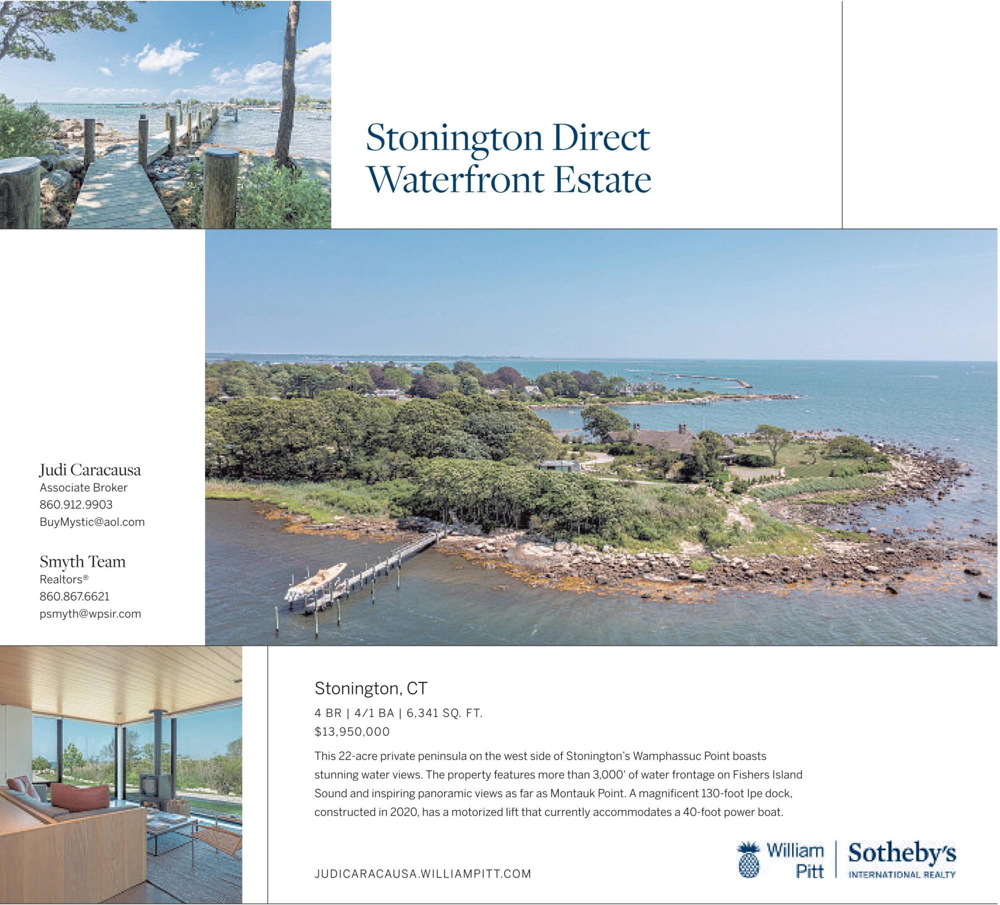 Stonington Direct Waterfront Estate Judi Caracausa Associate Broker 860.912.9903 BuyMystic@aol.com Smyth Team Realtors® 860.867.6621 psmyth@wpsir.com