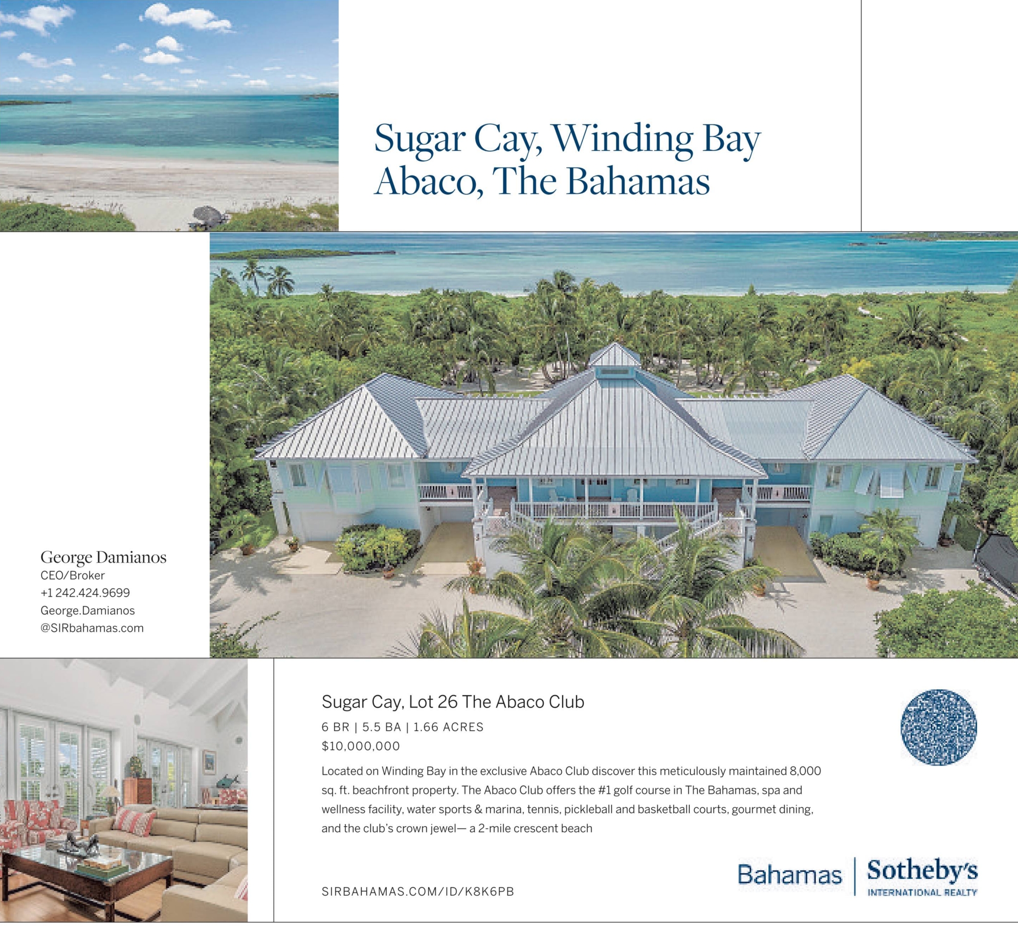Located on Winding Bay in the exclusive Abaco Club discover this meticulously maintained 8,000 sq. ft. beachfront property. The Abaco Club offers the #1 golf course in The Bahamas, spa and wellness facility, water sports & marina, tennis, pickleball and basketball courts, gourmet dining, and the club’s crown jewel— a 2-mile crescent beach
