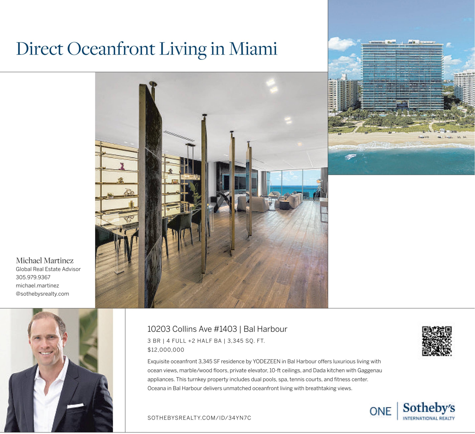 Exquisite oceanfront 3,345 SF residence by YODEZEEN in Bal Harbour offers luxurious living with ocean views, marble/wood floors, private elevator, 10-ft ceilings, and Dada kitchen with Gaggenau appliances. This turnkey property includes dual pools, spa, tennis courts, and fitness center. Oceana in Bal Harbour delivers unmatched oceanfront living with breathtaking views.