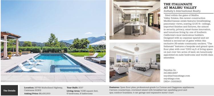 The Details Location: 26769 Mulholland Highway, Calabasas 91302 Asking Price: $8,450,000 Year Built: 2017 Living Area: 7,036 square feet, 6 bedrooms, 8 bathrooms THE ITALIANATE AT MALIBU VALLEY Sotheby’s International Realty Sited within the gates of Malibu Valley Estates, this newer-construction Mediterranean estate features breathtaking panoramic views, soaring 12-20 ft+ ceilings, imported finishes and fixtures, the utmost in security, privacy, smart-home innovation, and luxurious living by one of Southern California’s most meticulous builders. Designed with no expense spared and set behind a second set of gates within this exclusive 26-estate community enclave, “The Italianate” features a bespoke and grand open floor plan with over 7,000 sq ft of living space on just over two acres of land, six luxuriously appointed en-suite bedrooms and world-class amenities. Neyshia Go 310.882.8357 neyshia@neyshiago.com neyshiago.com DRE#: 01933923 Features: Open floor plan; professional-grade La Cornue and Gaggenau appliances; Carrara countertops; oversized island with breakfast bar; sparkling pool and spa; outdoor fountains; 4-car garage and expansive motor court See also