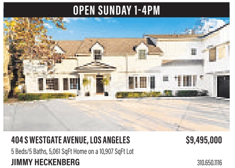 yes OPEN SUNDAY 1-4PM 404SWESTGATEAVENUE,LOSANGELES $9,495,000 5Beds/5Baths,5,061 SqFt Home on a10,907SqFtLot JIMMY HECKENBERG 310.650.1116 See also