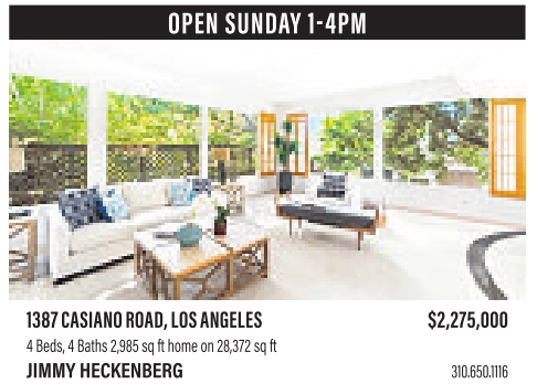yes OPEN SUNDAY 1-4PM 1387CASIANOROAD, LOSANGELES $2,275,000 4Beds, 4Baths 2,985sqfthomeon28,372sqft JIMMY HECKENBERG 310.650.1116 See also