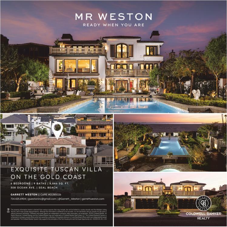 READY WHEN YOU ARE E XQ U I S I T E T U S C A N V I L L A O N T H E G O L D C O A S T 6 BEDROOMS | 9 BATHS | 8,646 SQ. FT. 308 OCEAN AVE. | SEAL BEACH GARRETT WESTON | CalRE #01385026 714.425.6904 | gwestoninc@gmail.com | @Garrett_Weston | garrettweston.com The property information herein is derived from various sources that may include, but not be limited to, county records and the Multiple Listing Service, anditmay includeapproximations.Althoughthe informationisbelievedtobeaccurate, it is notwarranted,and youshouldnot rely upon it withoutpersonalverification.Affiliatedrealestateagentsare independentcontractorsales associates,not employees. ©2025 Coldwell Banker.All Rights Reserved.ColdwellBankerand theColdwellBankerlogoare trademarks of Coldwell Banker Real Estate LLC.The Coldwell Banker®Systemis comprisedofcompany ownedofficeswhich areownedbyasubsidiary of Anywhere Advisors LLCand franchised offices whichare independently owned andoperated. TheColdwellBankerSystemfullysupportsthe principles of theFairHousing Actand theEqual Opportunity Act. 25ZUD9-DC_OC_1/25