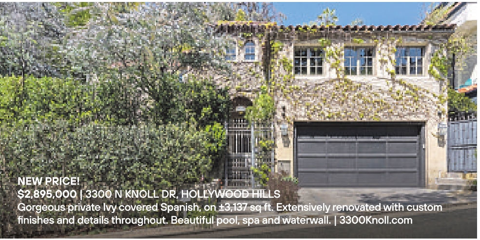 NEW PRICE! $2,895,000 | 3300 NKNOLL DR, HOLLYWOOD HILLS Gorgeous private Ivy covered Spanish, on ±3,137 sqft. Extensively renovated with custom finishes and details throughout. Beautiful pool, spa and waterwall. | 3300Knoll.com