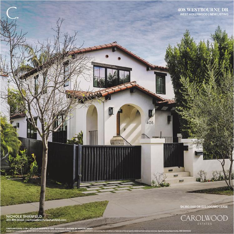 408 WESTBOURNE DR WEST HOLLYWOOD | NEW LISTING NICHOLE SHANFELD 310.499.8064 | nichole@nicholeshanfeld.com $4,350,000 OR $22,000/MO LEASE CAROLWOODRE.COM |NICHOLE SHANFELD DRE 02093007 |SHOWN BY APPOINTMENT ©2025 Carolwood Estates. Broker does not guarantee the accuracyofsquare footage,lot size, orother information concerningthe condition or features of theproperty obtained from various sources. Equal Housing Opportunity. DRE 02200006