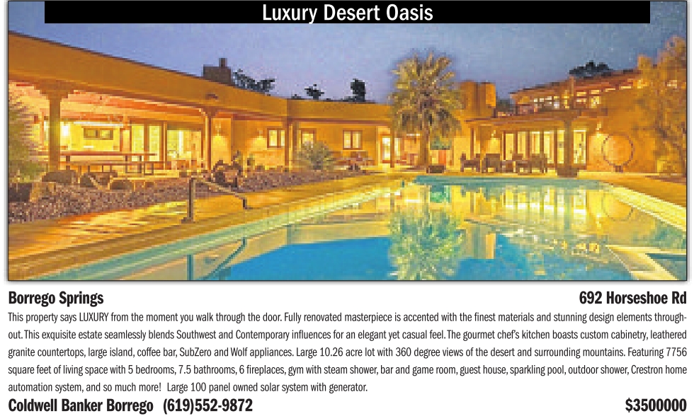 Luxury Desert Oasis Borrego Springs 692 Horseshoe Rd This property says LUXURY from the moment you walk through the door.Fully renovated masterpiece is accented with the finest materials and stunning design elements throughout.This exquisite estate seamlessly blends Southwest and Contemporary influences for an elegant yet casual feel.The gourmet chef’s kitchen boasts custom cabinetry,leathered granite countertops, large island, coffee bar, SubZero andWolf appliances. Large 10.26 acre lot with 360 degree views of the desert and surrounding mountains. Featuring 7756 square feet of living space with 5bedrooms,7.5 bathrooms,6fireplaces,gym with steam shower,bar and game room,guest house,sparkling pool,outdoor shower,Crestron home automation system, and so much more! Large 100 panel owned solar system with generator. Coldwell Banker Borrego (619)552-9872 $3500000