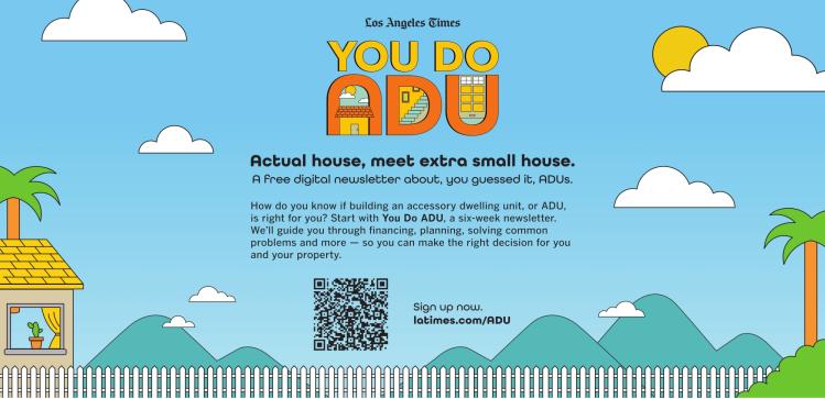 Actual house, meet extra small house. A free digital newsletter about, you guessed it, ADUs. How do you know if building an accessory dwelling unit, or ADU, is right for you? Start with You Do ADU, a six-week newsletter. We’ll guide you through financing, planning, solving common problems and more — so you can make the right decision for you and your property. Sign up now. latimes.com/ADU