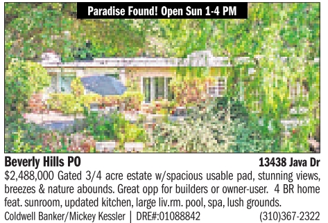 13438 Java Dr $2,488,000 Gated 3/4 acre estate w/spacious usable pad, stunning views, breezes & nature abounds. Great opp for builders or owner-user. 4 BR home feat. sunroom, updated kitchen, large liv.rm. pool, spa, lush grounds.