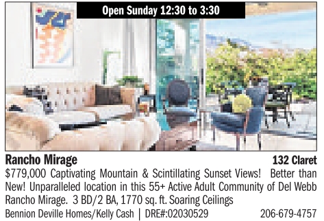 Open Sunday 12:30 to 3:30 Rancho Mirage 132 Claret $779,000 Captivating Mountain & Scintillating Sunset Views! Better than New! Unparalleled location in this 55+ Active Adult Community of Del Webb Rancho Mirage. 3 BD/2 BA, 1770 sq. ft. Soaring Ceilings Bennion Deville Homes/Kelly Cash | DRE#:02030529 206-679-4757