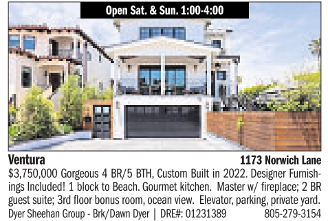 1173 Norwich Lane $3,750,000 Gorgeous 4 BR/5 BTH, Custom Built in 2022. Designer Furnishings Included! 1 block to Beach. Gourmet kitchen. Master w/ fireplace; 2 BR guest suite; 3rd floor bonus room, ocean view. Elevator, parking, private yard.