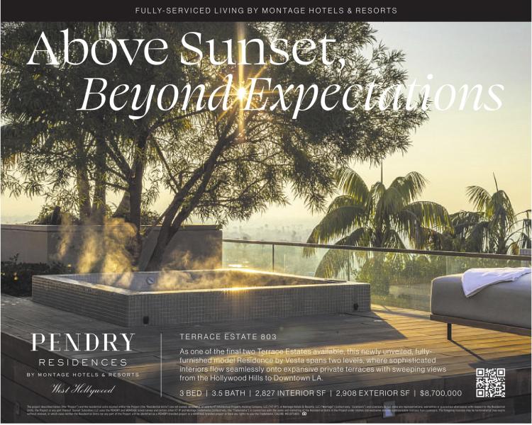 F U L LY- S E RV I C E D L I V I N G B Y M O NTAG E H OT E LS & R ES O RTS Above Sunset, Beyond Expectations T E R R AC E ESTATE 803 As one of the final two Terrace Estates available, this newly unveiled, fullyfurnished model Residence by Vesta spans two levels, where sophisticated interiors flow seamlessly onto expansive private terraces with sweeping views from the Hollywood Hills to Downtown LA. 3 BED | 3.5 BATH | 2,827 INTERIOR SF | 2,908 EXTERIOR SF | $8,700,000 The project described herein (the “Project”) and the residential units located within the Project (the “Residential Units”) are not owned, developed, or sold by KT Intellectual Property Holding Company, LLC (“KT IP”), orMontage Hotels &Resorts, LLC (“Montage”) (collectively, “Licensors”) and Licensors donot make any representations, warranties orguaranties whatsoever with respect to the Residential Units, the Project or any part thereof. Sunset Subsidiary LLC uses the PENDRY and MONTAGE brand names and certain other KT IP and Montage trademarks (collectively, the “Trademarks”) in connection with the sales and marketing ofthe Residential Units in the Project under limited, non-exclusive and non-sublicensable licenses from Licensors. The foregoing licenses may beterminated or may expire without renewal, inwhich case neither the Residential Units nor any part ofthe Project will beidentified asaPENDRY-branded project or aMONTAGE-branded project or have any rights touse the Trademarks. CALDRE #01973483