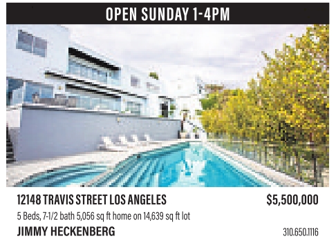 yes OPEN SUNDAY 1-4PM 12148TRAVISSTREETLOSANGELES $5,500,000 5Beds, 7-1/2 bath5,056sqfthomeon14,639sqftlot JIMMY HECKENBERG 310.650.1116 See also