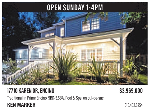 yes OPEN SUNDAY 1-4PM 17710KARENDR,ENCINO $3,969,000 Traditional in PrimeEncino. 5BD-5.5BA, Pool & Spa, oncul-de-sac KENMARKER 818.402.6254 See also