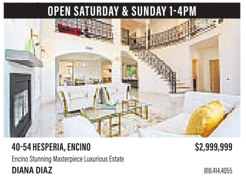 yes OPEN SATURDAY & SUNDAY 1-4PM 40-54HESPERIA,ENCINO $2,999,999 EncinoStunning Masterpiece Luxurious Estate DIANA DIAZ 818.414.4055 See also