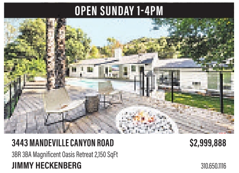 yes OPEN SUNDAY 1-4PM 3443MANDEVILLECANYONROAD $2,999,888 3BR3BA Magnificent OasisRetreat 2,150SqFt JIMMY HECKENBERG 310.650.1116 See also