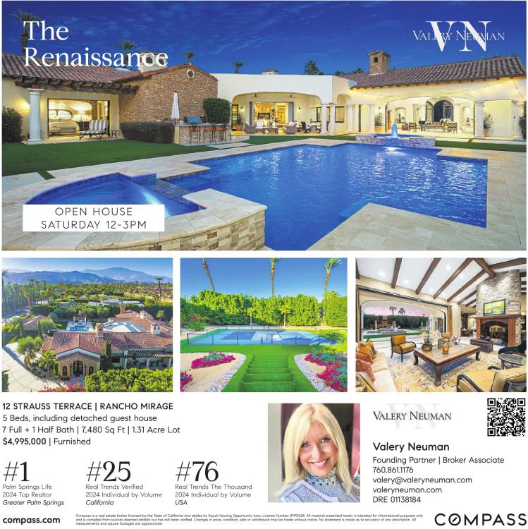 The Renaissance OPEN HOUSE SATURDAY 12-3PM 12 STRAUSS TERRACE | RANCHO MIRAGE 5 Beds, including detached guest house 7 Full + 1 Half Bath | 7,480 Sq Ft | 1.31 Acre Lot $4,995,000 | Furnished #1 Palm Springs Life 2024 Top Realtor Greater Palm Springs #25 Real Trends Verified 2024 Individual by Volume California #76 Real Trends The Thousand 2024 Individual by Volume USA Valery Neuman Founding Partner | Broker Associate 760.861.1176 valery@valeryneuman.com valeryneuman.com DRE 01138184 compass.com Compass isareal estate broker licensed bythe State ofCalifornia and abides byEqual Housing Opportunity laws. License Number 01991628. All material presented herein is intended for informational purposes only and iscompiled from sources deemed reliable but has not been verified. Changes inprice, condition, sale or withdrawal may bemade without notice. No statement ismade as to accuracy of any description. All measurements and square footages are approximate.