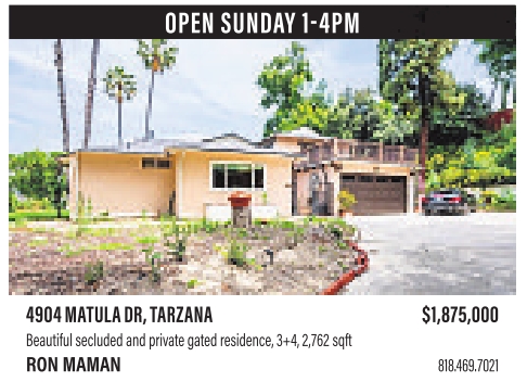 yes OPEN SUNDAY 1-4PM 4904MATULADR,TARZANA $1,875,000 Beautifulsecludedand privategated residence, 3+4, 2,762sqft RONMAMAN 818.469.7021 See also