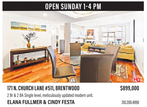 yes OPEN SUNDAY 1-4 PM 171N.CHURCHLANE#511, BRENTWOOD $899,000 2Br&2BASinglelevel,meticulously updatedmodernunit. ELANAFULLMER&CINDYFESTA 310.200.4890 See also